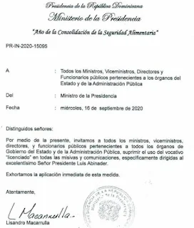 “Por medio de la presente invitamos a todos los ministros, viceministros, directores, y funcionarios públicos pertenecientes a todos los órganos de Gobierno del Estado y de la Administración Pública, suprimir el uso del vocativo “licenciado” en todas la misivas y comunicaciones, específicamente dirigidas al excelentísimo Señor Presidente Luis Abinader”, solicita Macarrulla.