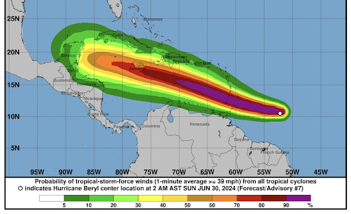Asimismo, Beryl se mueve hacia el oeste a unos 33 kilómetros por hora y se espera que continúe con este movimiento durante los próximos días. Sus vientos máximos sostenidos son estimados en unos 155 kilómetros por hora con ráfagas superiores.